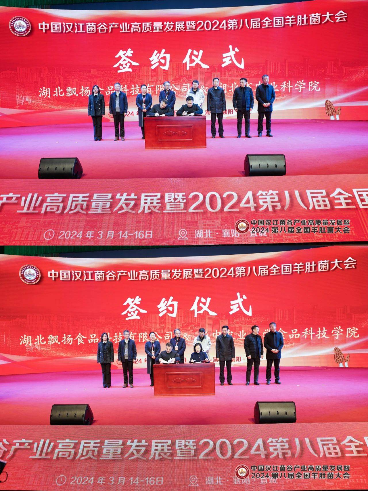 致辞结束后,湖北飘扬食品科技有限公司和湖北省农业科学院就珍稀食用菌生产技术研发与服务进行签约,同时飘扬公司还与华中农业大学就珍稀菌精深加工新技术及新产品研发进行签约;中国菌物学会理事长郭良栋向宜城授予“中国汉江菌谷科普基地”牌匾,华中农业大学边银丙教授为湖北飘扬食品科技有限公司、漳州金黑宝食用菌机械有限公司、重庆美哉菌业有限公司、山东菌胜生物科技有限责任公司、武汉华裕新美菌业有限公司、湖北菇友生物科技发展有限公司、湖北裕山食用菌机械有限公司、华中农业大学应用真菌研究所、襄阳市农业科学院、襄阳市农业技术推广中心、宜城市农业农村局、宜城市科学技术和经济信息化局等12家协办单位授牌。